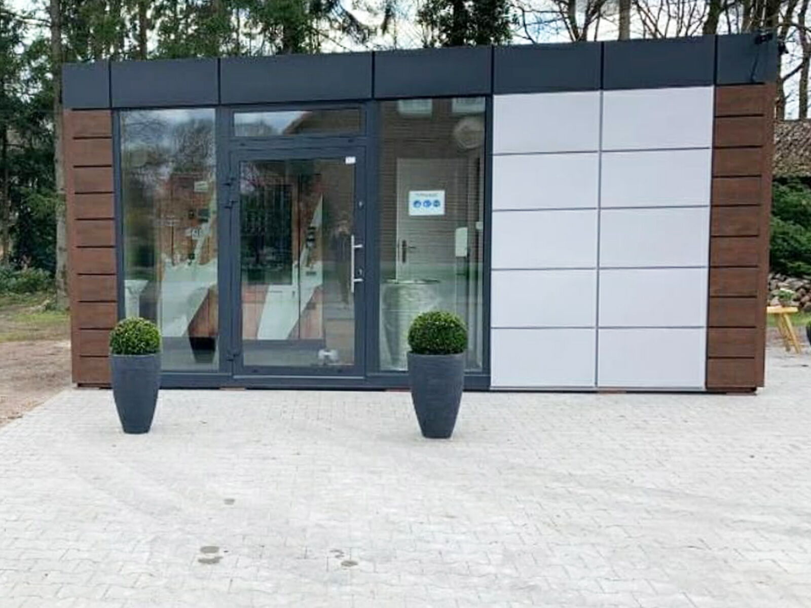 Boerderijwinkelcontainer met royale raampartij, 120 mm isolatie en modern design – ideaal voor een uitnodigende productpresentatie op het erf of op open terreinen.