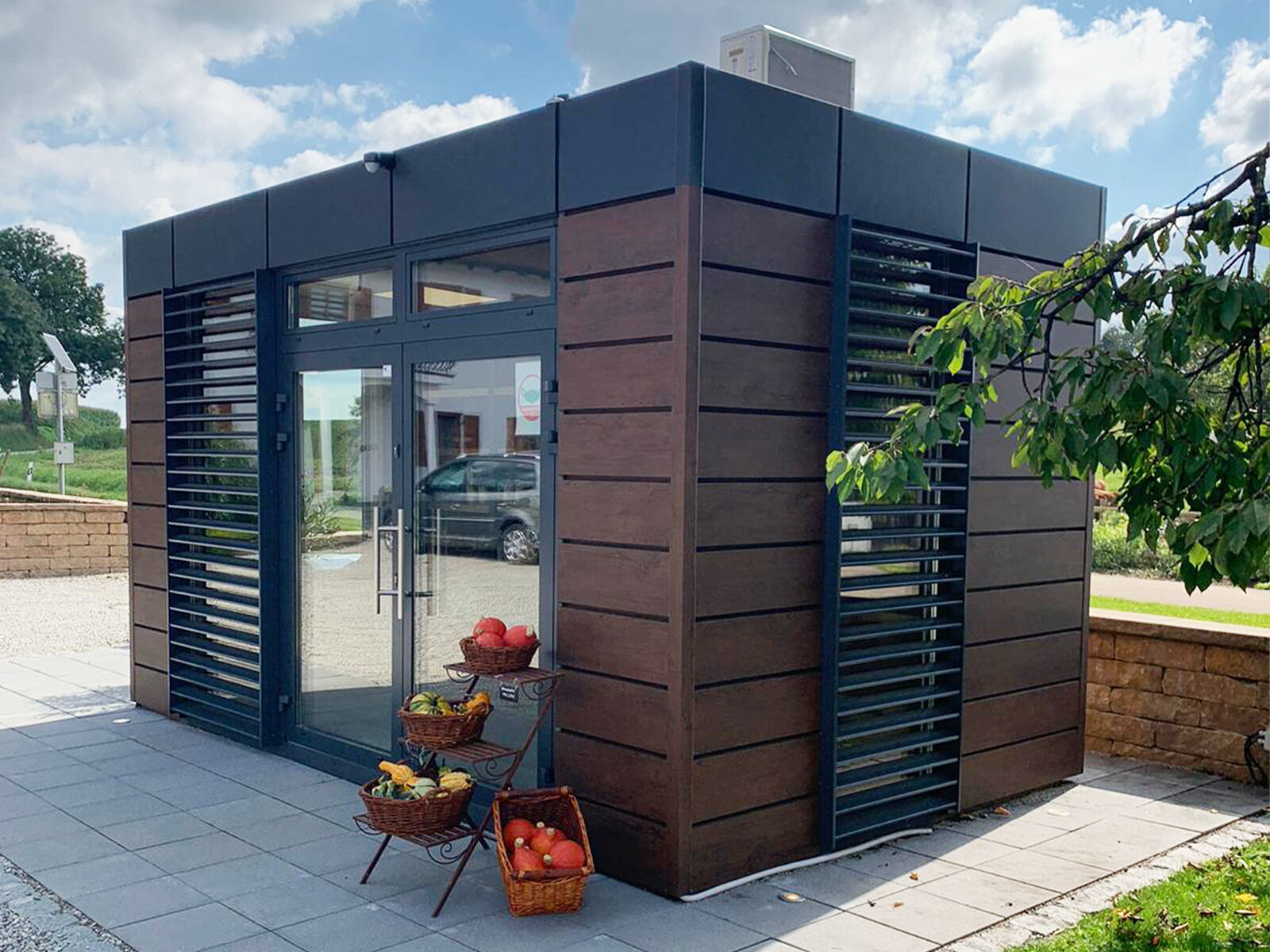 Representatieve Boerderijwinkelcontainer in houtlook met hoogwaardige uitstraling – perfect voor veeleisende directe marketing met focus op regionaliteit en merkbekendheid.