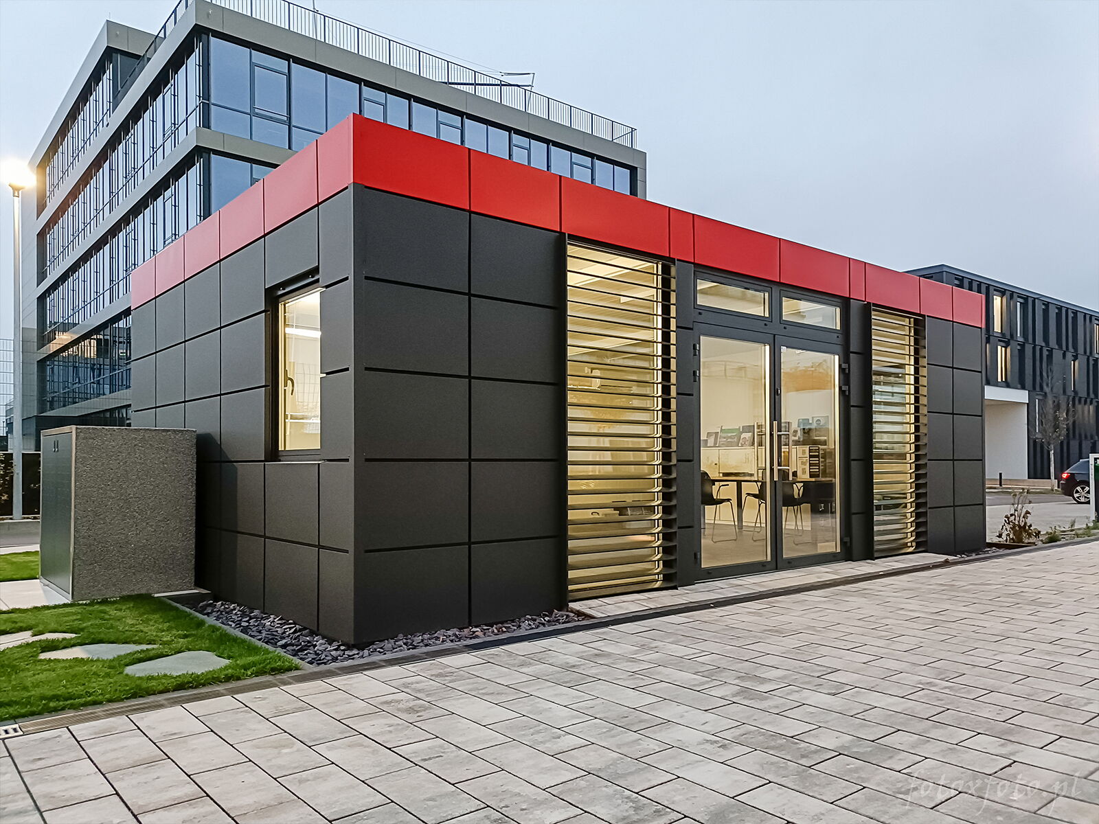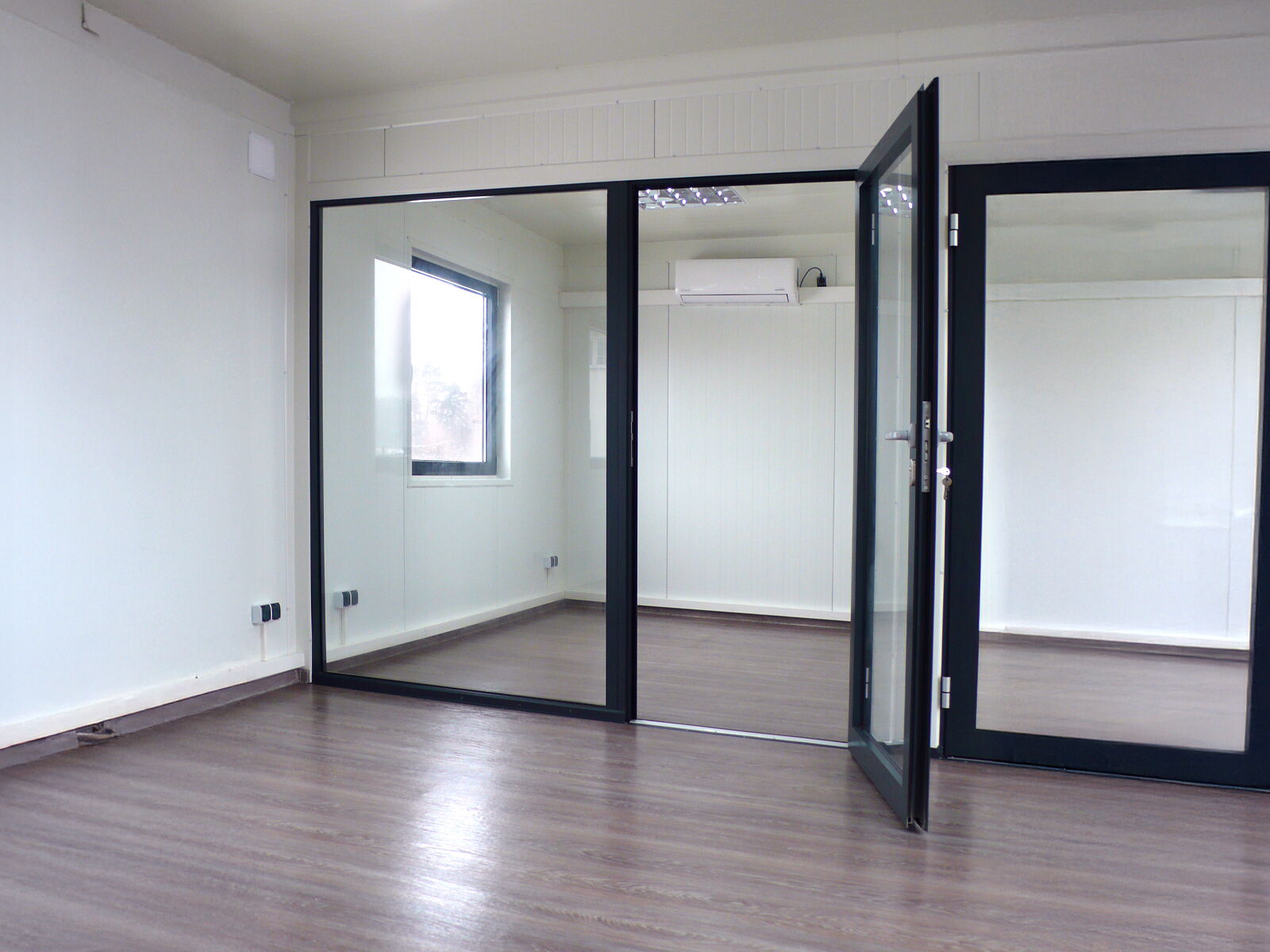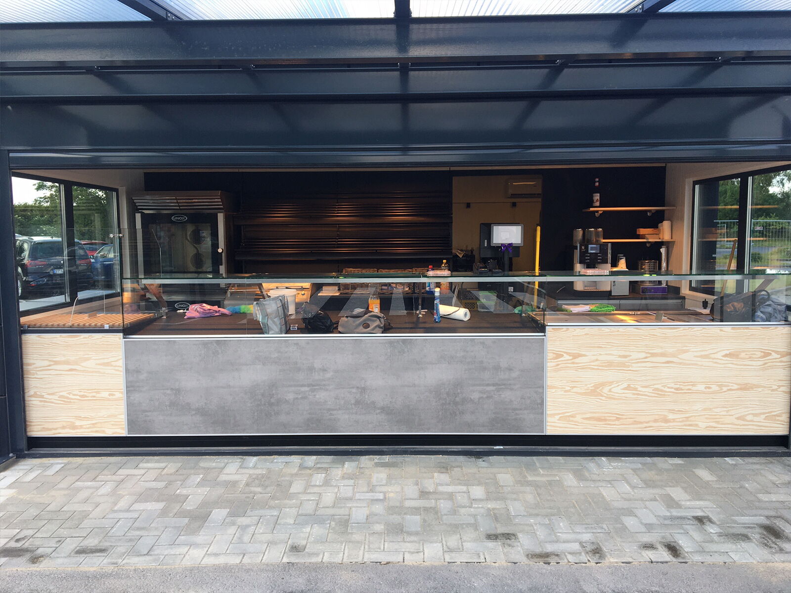 Verkoopcontainer met royale raampartij, 120 mm isolatie en modern design – ideaal voor een uitnodigende productpresentatie op het erf of op open terreinen.